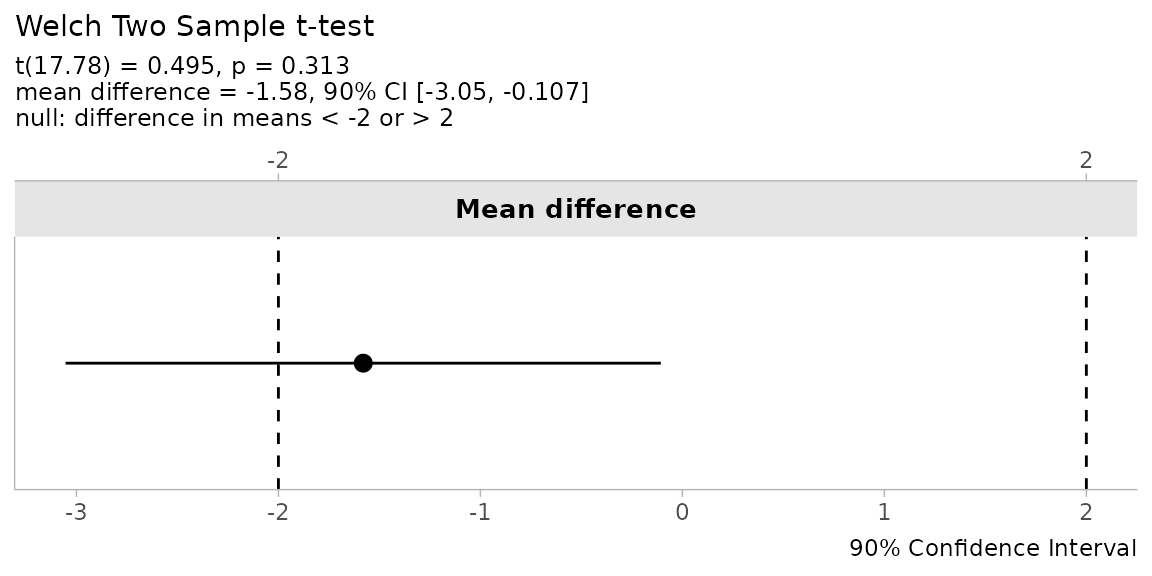#> [1] "The Welch Two Sample t-test is not statistically significant (t(17.776) = 0.495, p = 0.313, mean of group '1' = 0.75, mean of group '2' = 2.33, mean difference ('1' - '2') = -1.58, 90% C.I.[-3.05, -0.107]) at a 0.05 alpha-level. The null hypothesis cannot be rejected. At the desired error rate, it cannot be stated that the true difference in means is between -2 and 2."