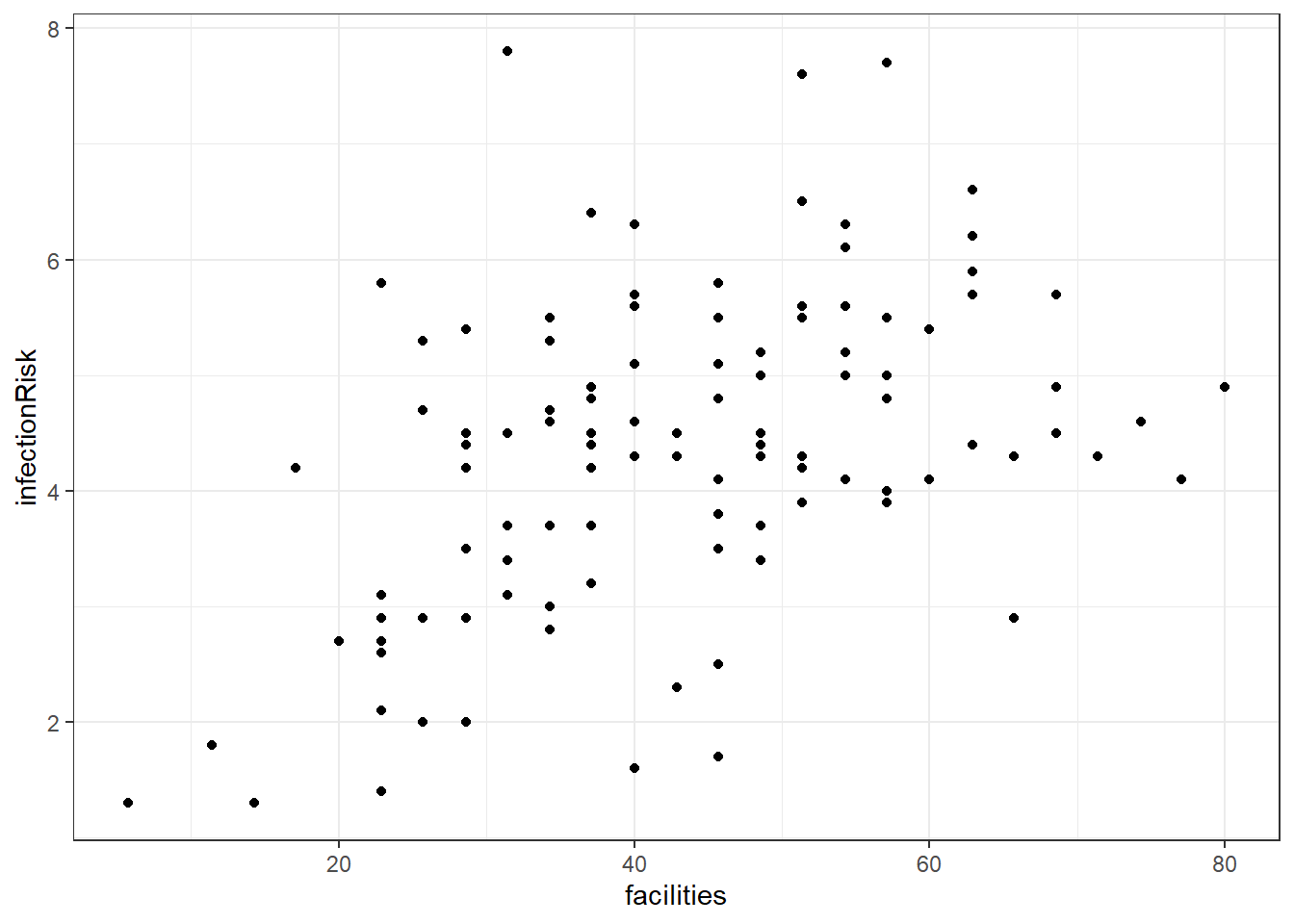 'SENIC.csv'))stayLength: Average length of stay of all patients in hospital (in days)age: Average age of patients (in years)infectionRisk: Average estimated probability of acquiring infection in hospital (in percent)cultureRatio: Ratio of number of cultures performed to number of patients without signs or symptoms of hospital-acquired infection, times 100xrayRatio: Ratio of number of X-rays performed to number of patients , without signs or symptoms of pneumonia, times 100beds: Average number of beds in hospital during study periodschoolMed school affiliation (Yes or No)region: Geographic region (NE, NC, S, W)patients: Average number of patients in hospital per day during study periodnurses: Average number of full-time equivalent registered and licensed practical nurses during study period (number full-time plus one half the number part time)facilities: Percent of 35 potential facilities and services that are provided by the hospital