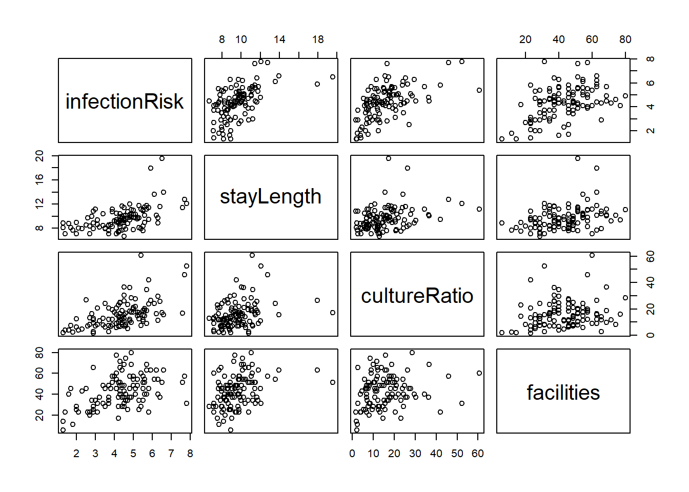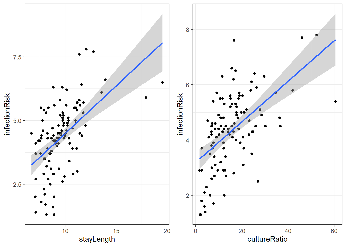 There are a lot of potential variables that may relate to infectionRisk, but let’s just concentrate on stayLength and cultureRatio.